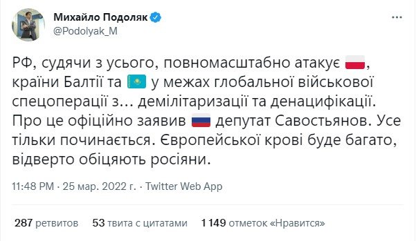 Радник керівника Офісу президента Михайло Подоляк у Twitter заявив, що росіяни хочуть «денацифікувати» ще шість країн.