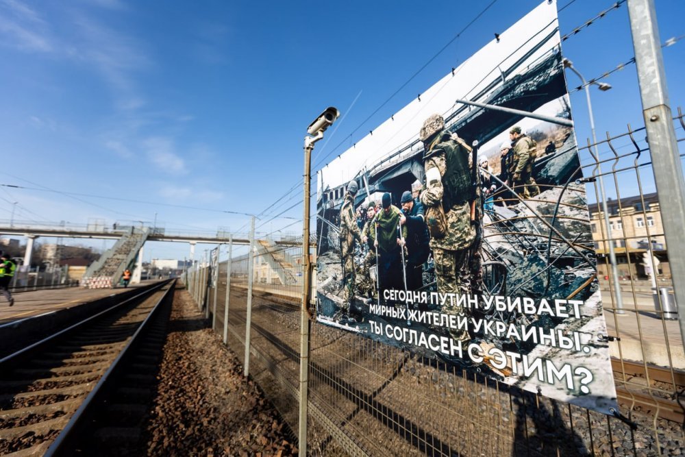 Виставка з 24 фотографій була встановлена ??на платформі транзитних поїздів. Зображення розміщені на висоті вікон вагонів. На знімках є напис «сьогодні Путін убиває мирне населення України. Ви згодні з цим?».