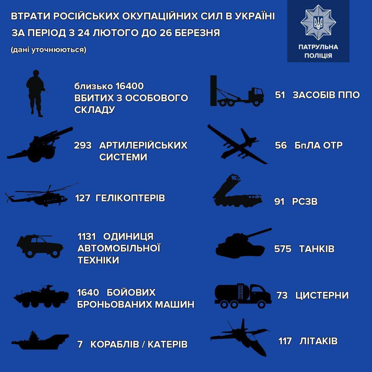 Генеральний штаб ЗСУ надав загальні бойові втрати противника з 24.02 по 26.03: