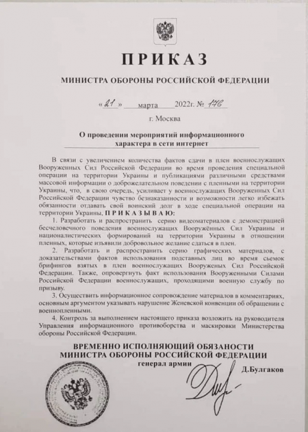 До речі, цей документ видав не міністр оборони росії Сергій Шойгу, а «тимчасовий виконувач обов'язків міністра оборони РФ» генерал Д. Булгаков.