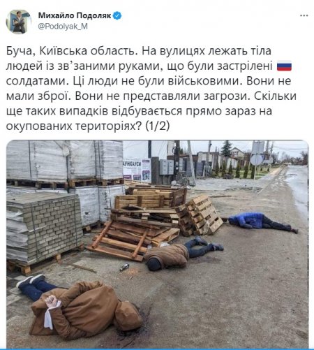У звільненій Бучі Київської області, фіксують велику кількість злочинів проти цивільного населення з боку російських окупантів. На вулицях міста лежить багато тіл вбитих мирних мешканців. Трупи лежать прямо на дорозі. Більшість вбитих – чоловіки. У багатьох вбитих зв'язані руки.