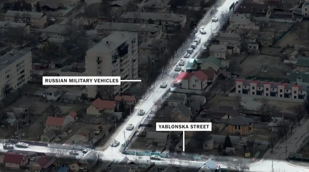 Понад 20 російських військових машин розташовані поруч із двома машинами, які відкрили вогонь, як на тій же вулиці, так і на кварталах вздовж перехрестя.