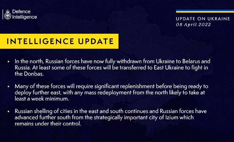 На півночі російські загарбники тепер повністю виведені з України до білорусі та рф. Деякі з них будуть перекинуті на схід України для спроби захопити Донбас. Такі свіжі дані розвідки Великобританії щодо ситуації в нашій країні.