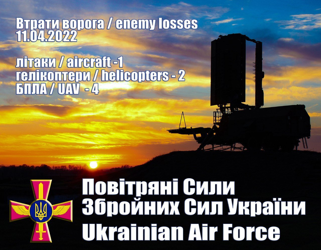 11 квітня зенітно-ракетні підрозділи Повітряних сил та ППО Сухопутних військ Збройних сил України знищили 7 повітряних цілей російських окупантів. Про це повідомило Командування Повітряних сил ЗСУ.