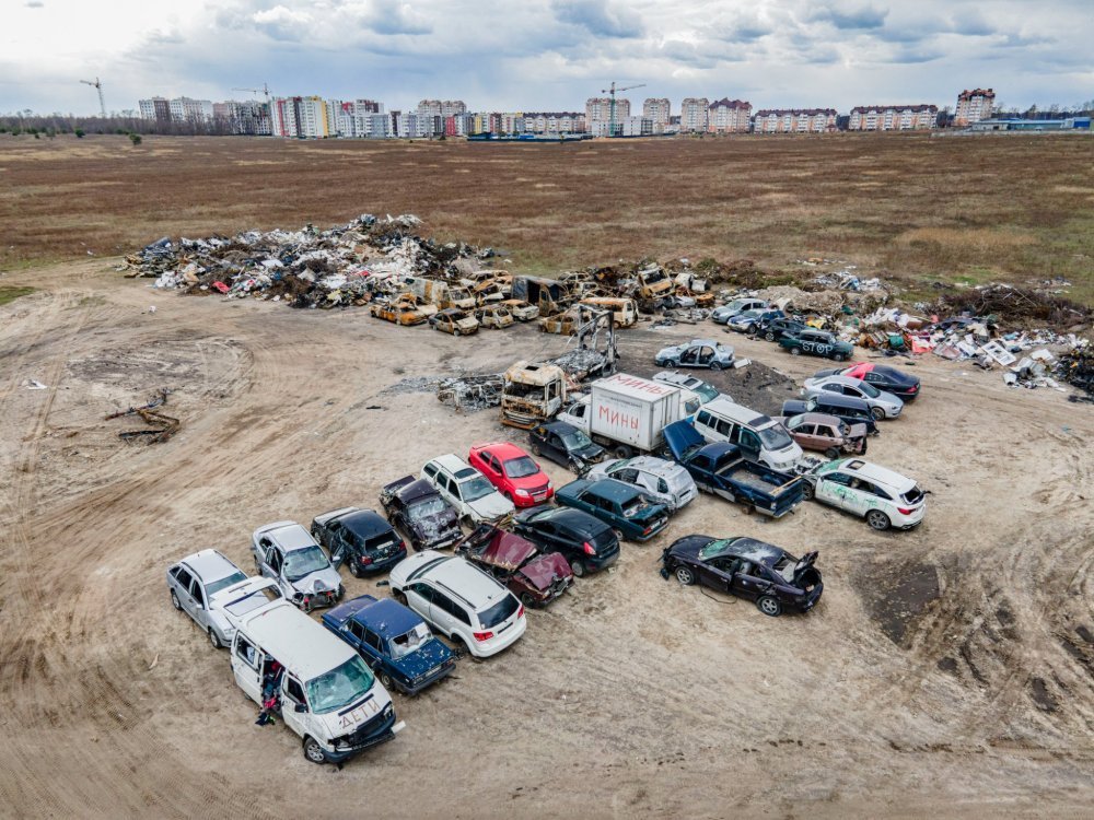 У Бучі Київської області з’явилося кладовище розстріляних автомобілів. Фото опублікувало видання «Українська правда».
