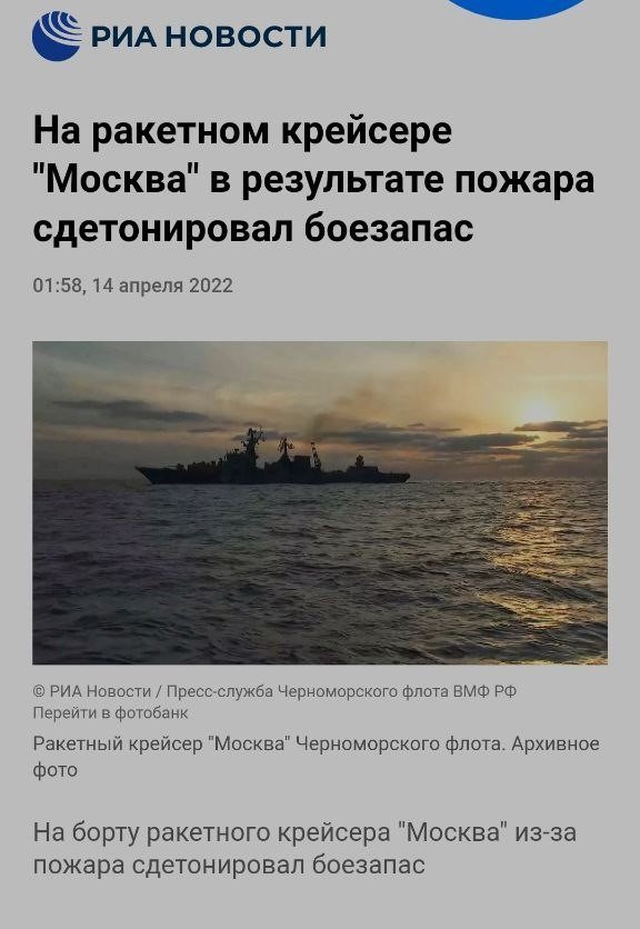 Разом з тим, міністерство оборони рф стверджує, що у результаті пожежі на кораблі «Москва» здетонував боєзапас, про що свідчить інформація у російських ЗМІ.
