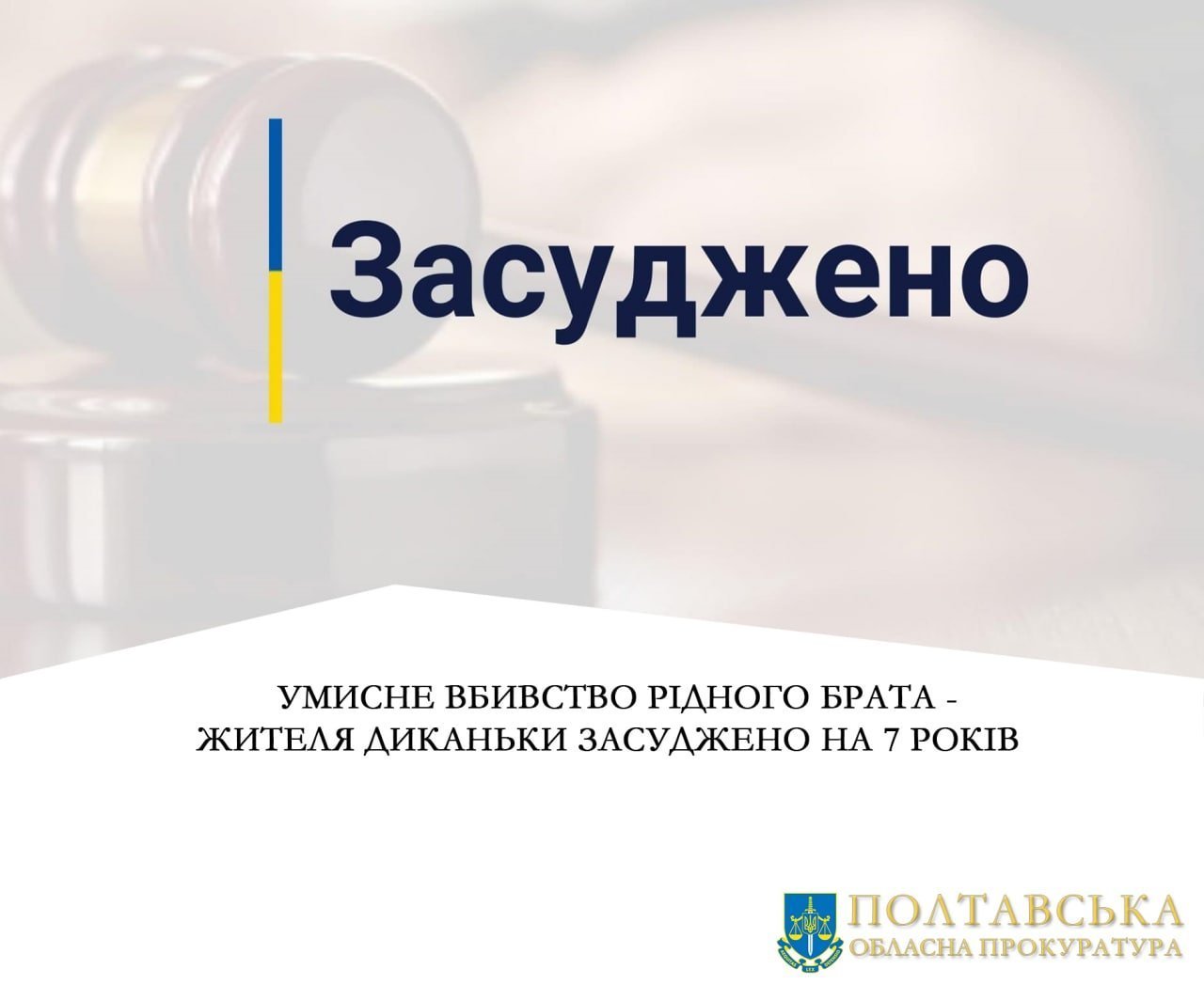 За публічного обвинувачення Диканської окружної прокуратури місцевого жителя визнано винним в умисному вбивстві рідного брата (ч. 1 ст. 115 КК України). Про це повідомляє пресслужба прокуратури Полтавської області.