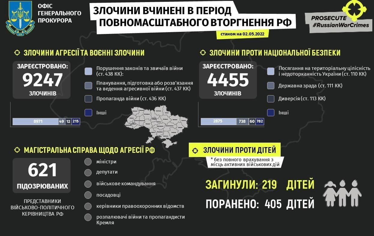 Офіс Генерального прокурора станом на 2 травня задокументував 9247 злочинів окупантів, вчинених у період повномасштабного вторгнення рф. Ворог здійснив 4455 злочинів проти національної безпеки і вбив 219 дітей.