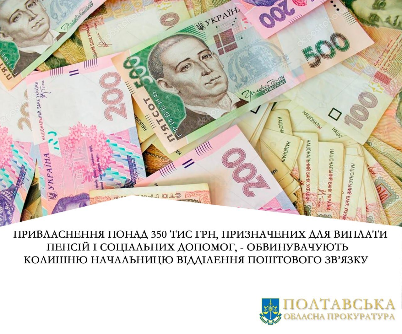 На Полтавщині колишня начальниця одного з відділень поштового зв’язку Полтавської дирекції Акціонерного товариства «Укрпошта» привласнила гроші, які були призначені для виплати пенсій і соціальних допомог. Про це інформує Полтавська обласна прокуратура.