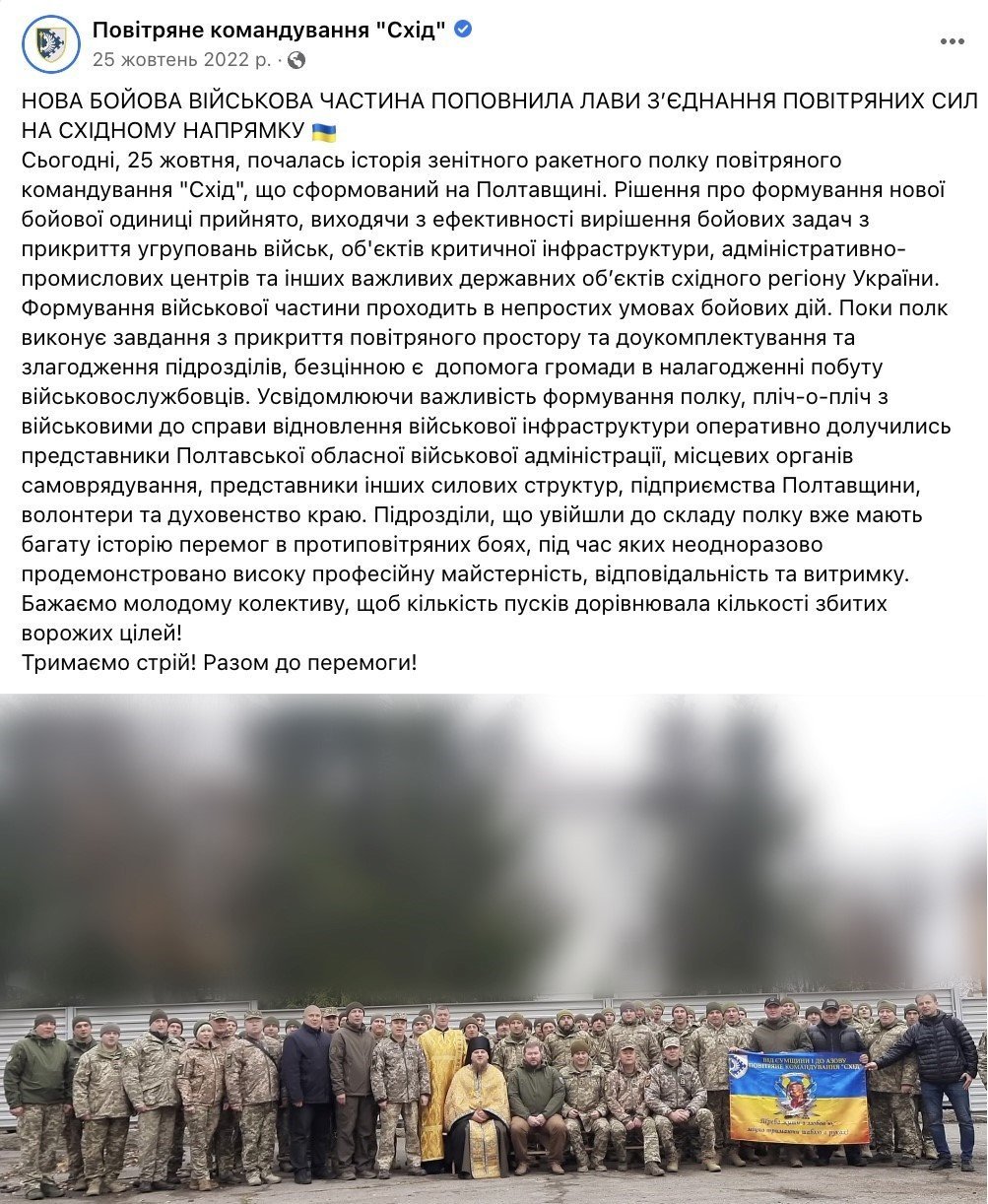 Інформацію про формування нового зенітного ракетного полку Повітряного командування «Схід» оприлюднили на офіційній фейсбук-сторінці Повітряного командування «Схід» 25 жовтня 2022 року (на фото вище). Лише після цього зазначені відомості розмістили на ресурсах Полтавської ОВА.