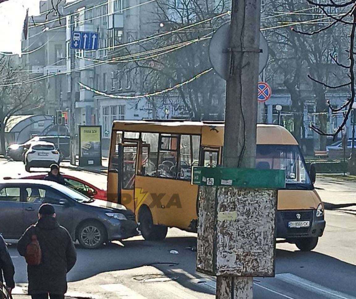 Легковий автомобіль в’їхав у маршрутку 2-в, очевидці припускають, що ДТП сталася через непрацюючі світлофори.
