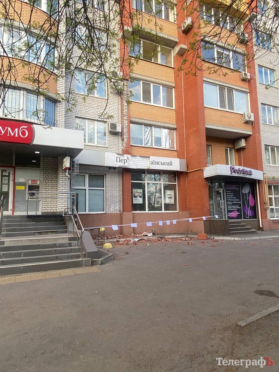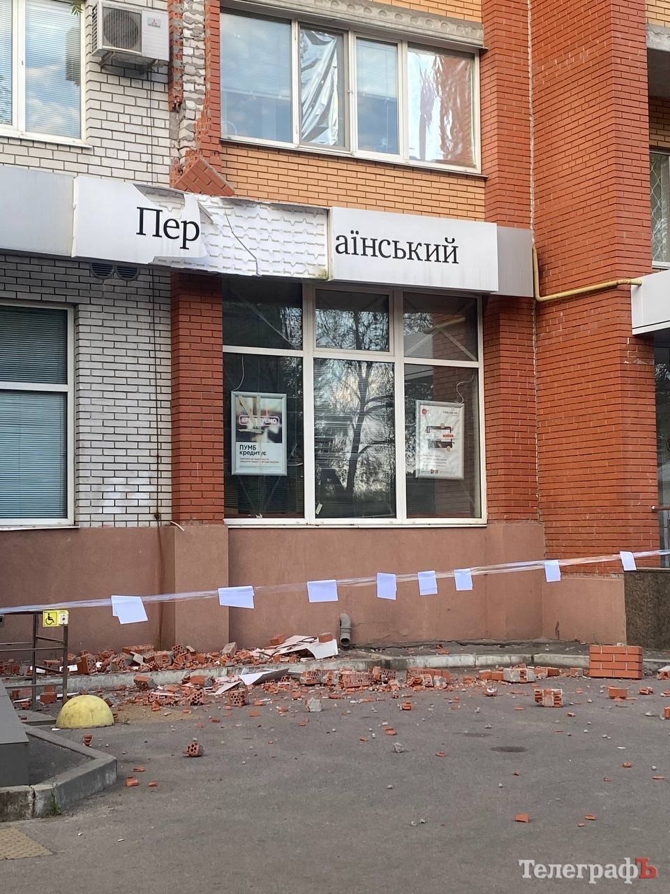 З фасаду будинку на вул. Перемоги 32/3 відвалився великий фрагмент фасаду. Цеглини розбили вивіску банку.