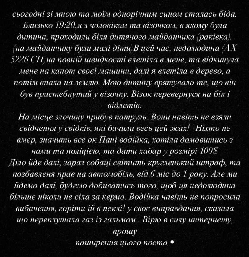 14 травня до редакції «Кременчуцького Телеграфа» звернулась кременчужанка Сніжана, яка повідомила, що у суботу 13 травня, о 19.20, на Раківці водійка автомобіля Nissan влетіла на повній швидкості в неї та у візочок з її однорічним сином.