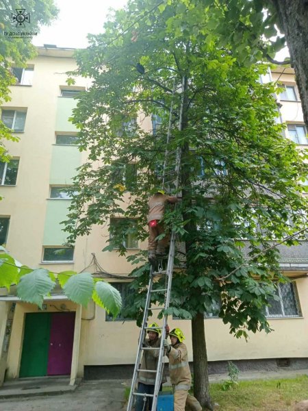 Його за допомогою драбини зняли рятувальники 15-ї державної пожежно-рятувальної частини. Тварину передали власнику.