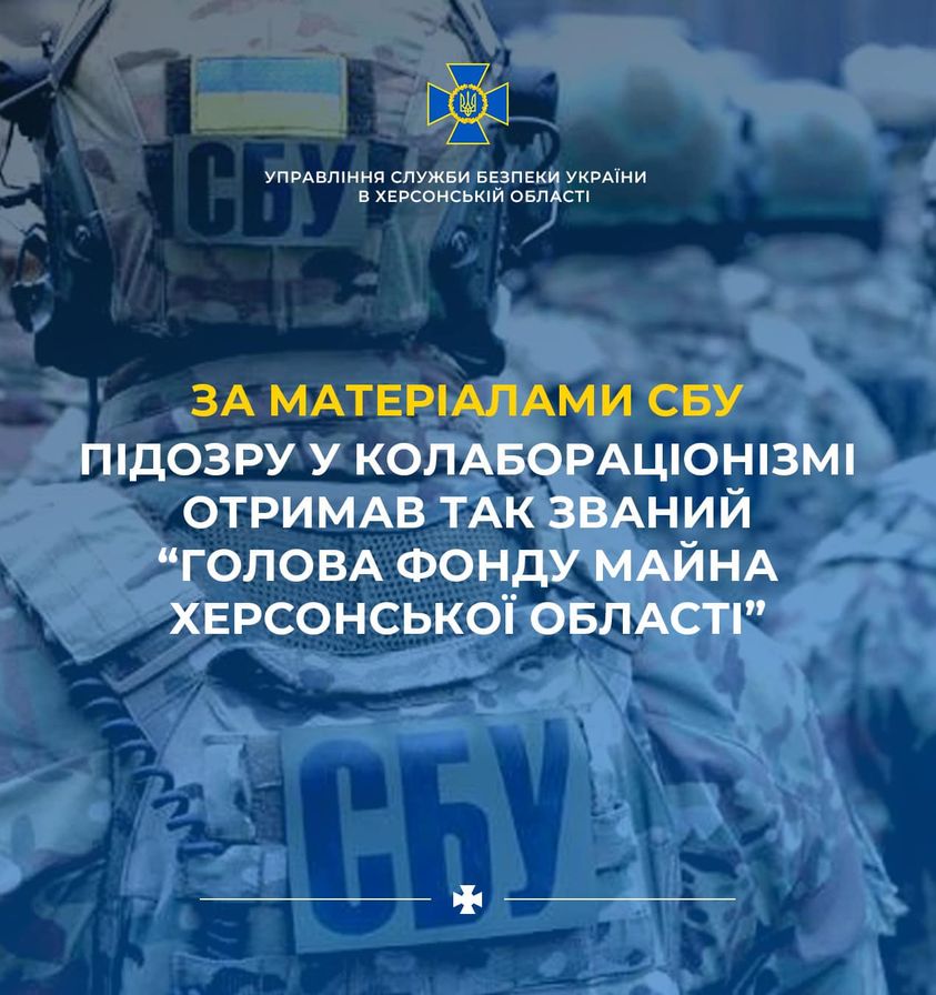 Полтавцю, так званому голові «Фонду майна Херсонської області», СБУ повідомила про підозру у колабораційній діяльності. Він співпрацював з військовими РФ і приїхав в Херсон очолити створену ними установу, повідомила на сторінці у Facebook Служба безпеки України.