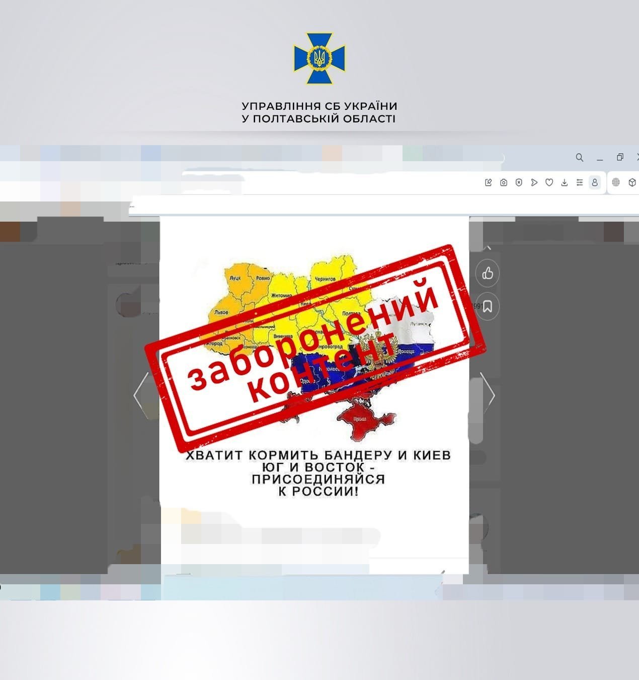 Фігурант закликав до «звільнення» України від «нацистів» і публікував дописи про необхідність приєднати Україну до Росії «силовим шляхом», усунення вищого керівництва держави силовим шляхом.