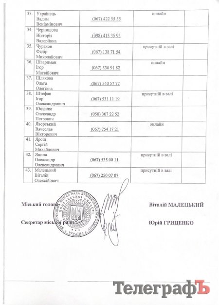 У списку, навпроти прізвища секретаря міської ради Юрія Гриценка стоїть відмітка, що він «присутній в залі», саме в залі сесійних засідань, а не в дистанційному режимі. Своєю чергою, як вбачається з відеозапису, і репліки міського голови Малецького, пан Гриценко на сесії був відсутній, оскільки знаходився у відрядженні, а отже в залі його бути не могло. Позивачі підкреслюють, що відеозапис сесії, згідно з регламентом Ради, є також офіційним документом і невіддільною частиною протоколу, тобто мова йде про свідоме надання суду неправдивих відомостей шляхом фальсифікації та підробки документів.