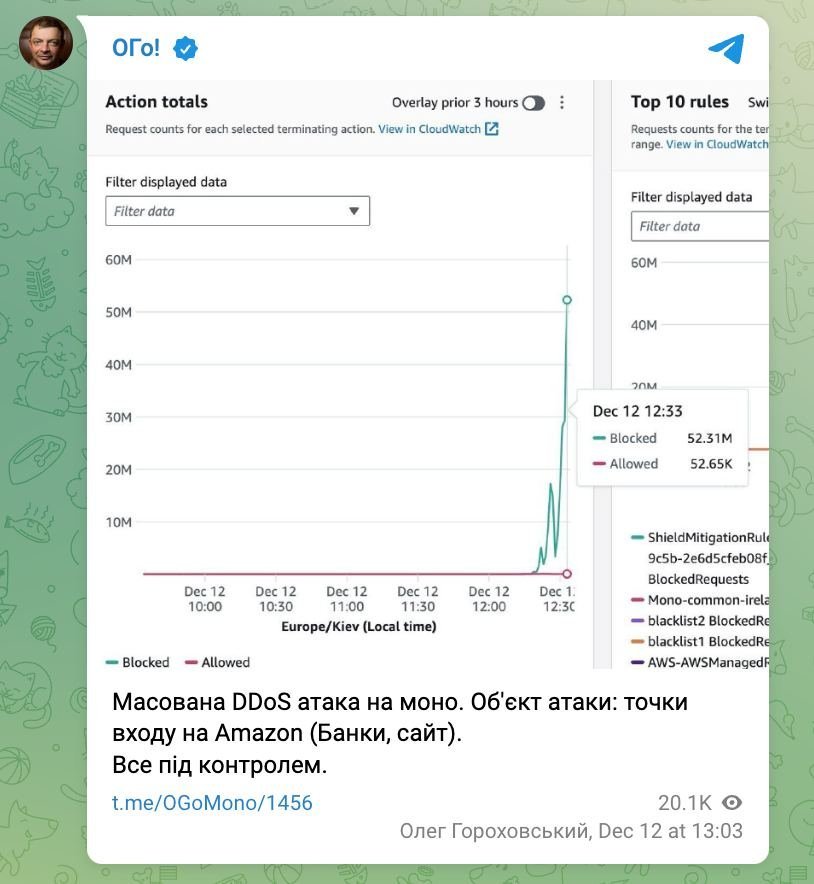 Сьогодні, 12 грудня, крім хакерської атаки на компанію «Київстар», була здійснена DDoS атака (Розподілені хакерські атаки на відмову в обслуговуванні, спрямовані на вебсайти й сервери та здійснюються для того, щоб порушити роботу мережевих служб) на MonoBank. Про це повідомив голова «Монобанку» Олег Гороховський у своєму Телеграм-каналі.
