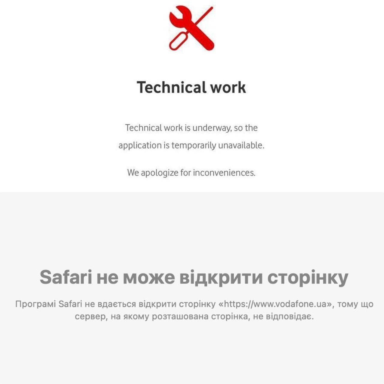 Також стався збій в роботі оператора мобільного зв’язку Vodafon. Користувачі повідомляють, що не працює додаток і сайт. При відкритті вікна з’являється повідомлення: «Технічні роботи», а через сайт не завантажується зовсім.