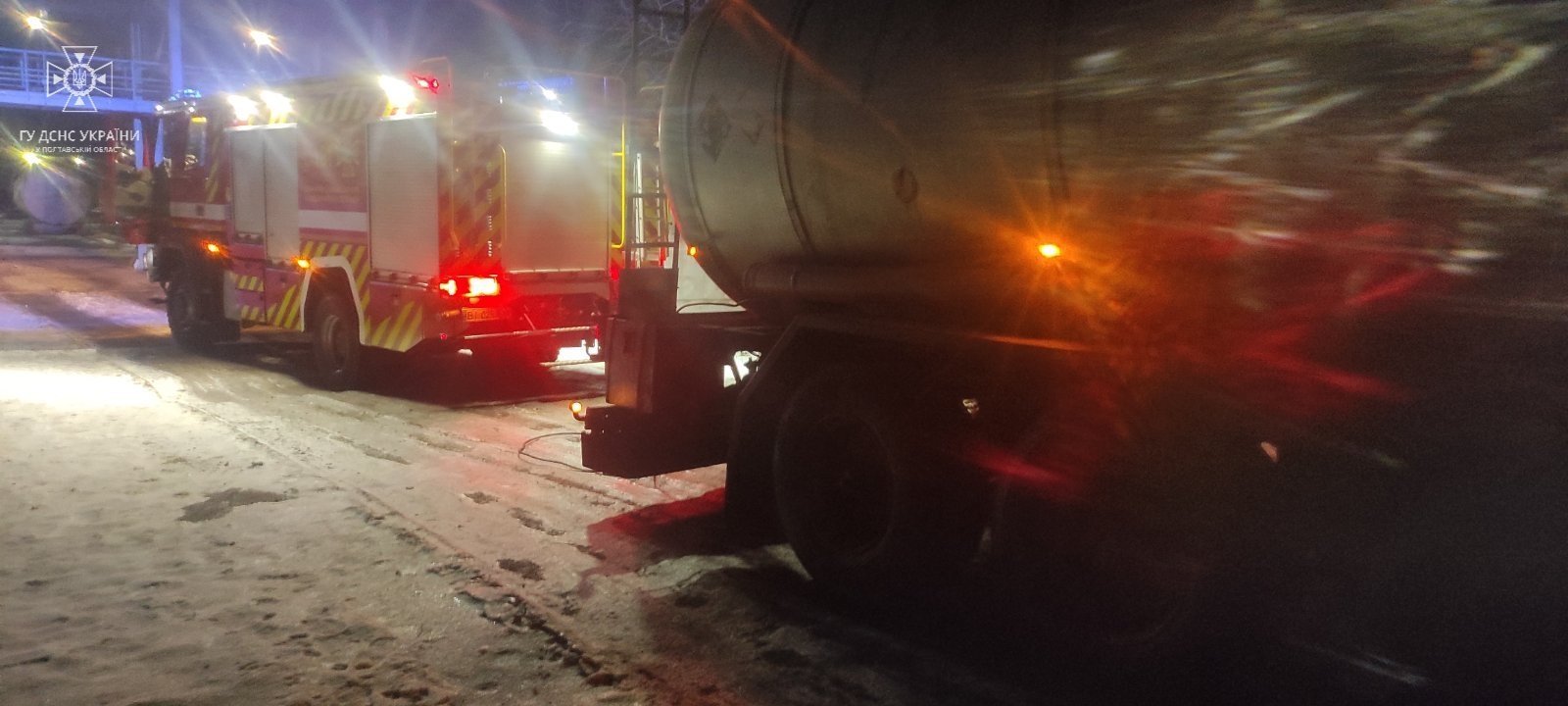 Рятувальники за допомогою тросу від пожежного автомобіля відбуксирували вантажний автомобіль на безпечну ділянку дороги.