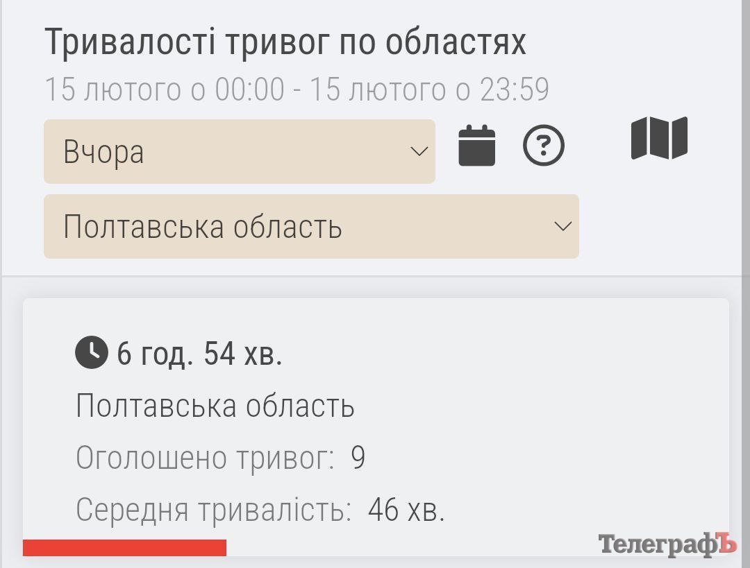 За минулу добу на Полтавщині повітряна тривога лунала 9 разів і тривала майже 7 годин.