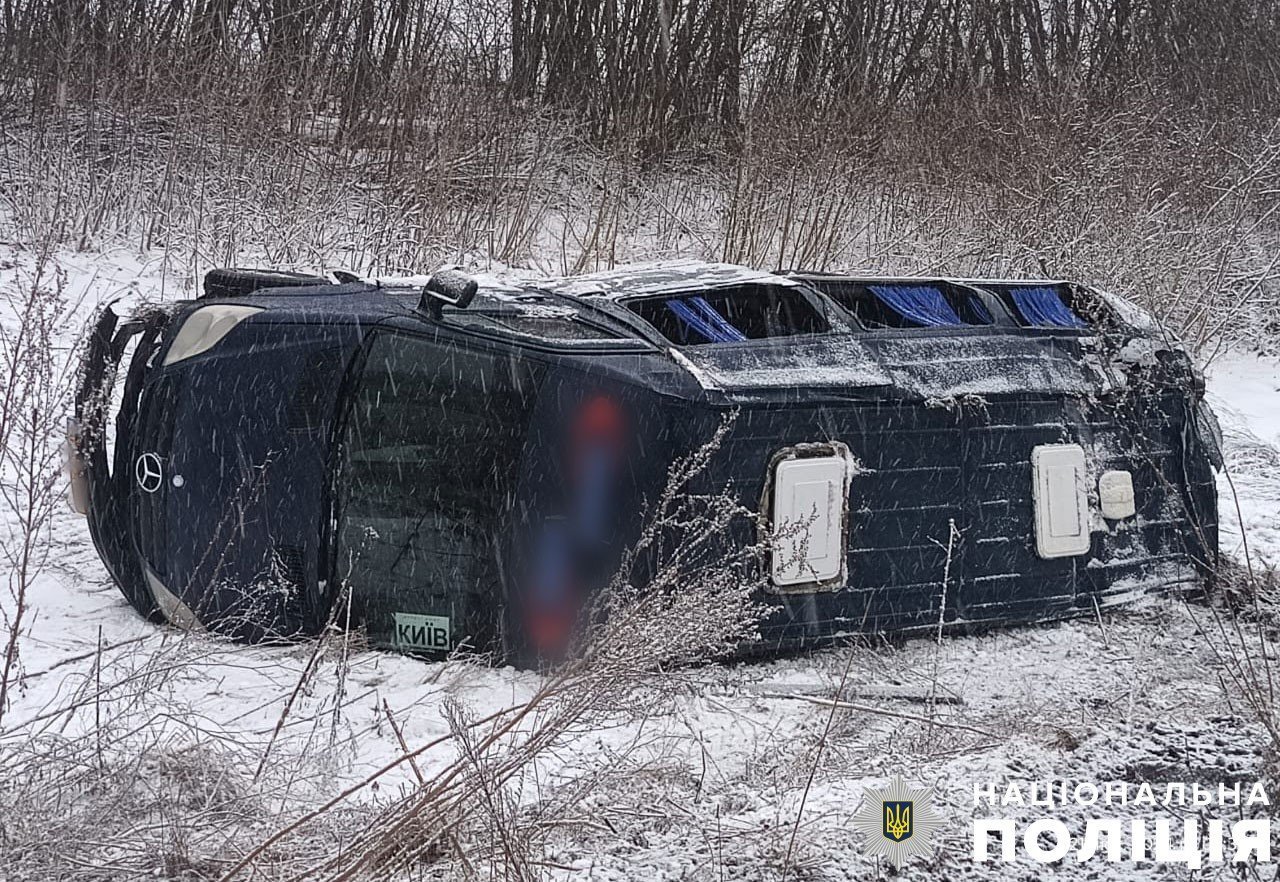 За даними правоохоронців, пасажирський мікроавтобус Mersedes-Benz Sprinter на засніженій дорозі з’їхав у кювет і перекинувся. Внаслідок аварії постраждала одна пасажирка — її з травмами ушпиталили.