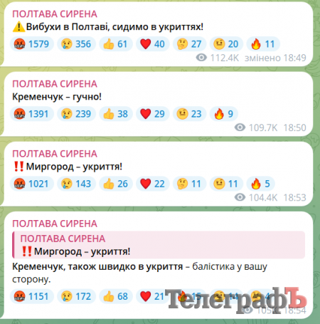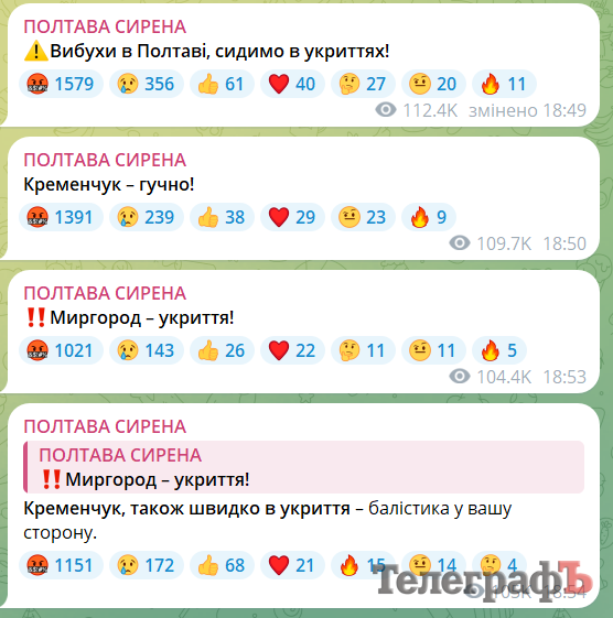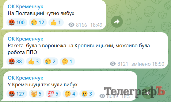 Про вибухи у Кременчуці та Полтаві повідомляли у телеграм-каналах