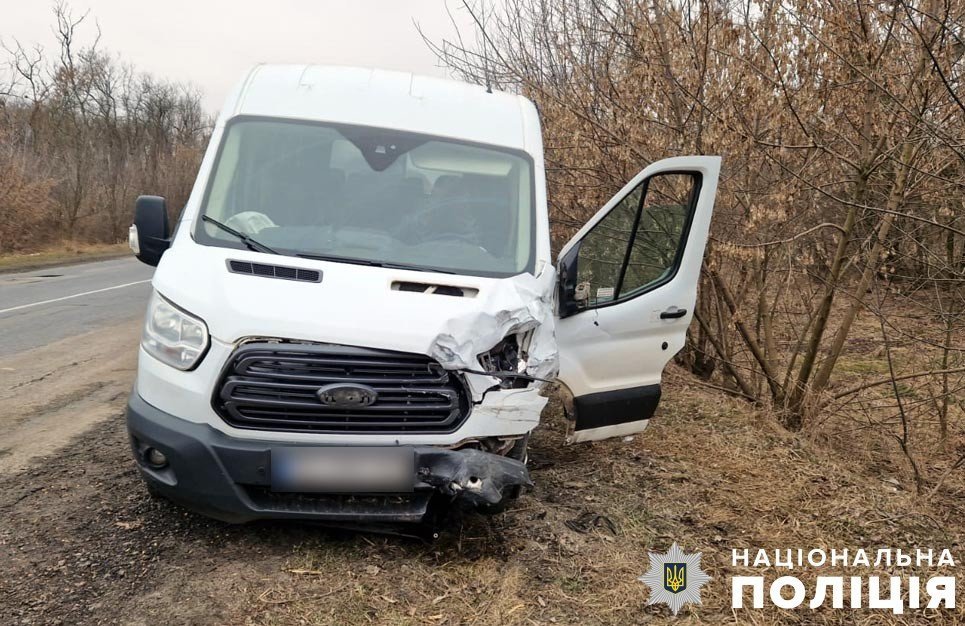 За даними правоохоронців водій мікроавтобуса Ford Transit виїхав на зустрічну смугу та врізався у службовий поліцейський автомобіль ВАЗ 2107.