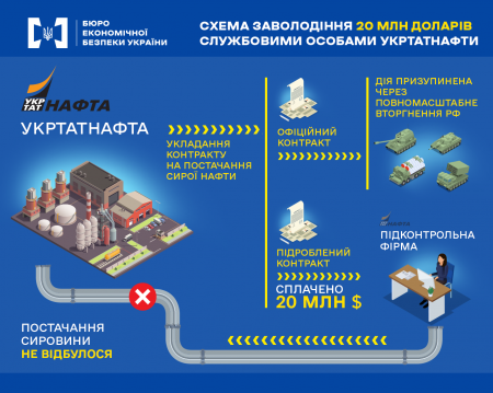За даними слідства, в перший день повномасштабного вторгнення Росії, злочинна група, організована обвинуваченою, вивела кошти з рахунків Укртатнафти, підробивши документацію на імпорт сирової нафти, який був неможливий через бойові дії.