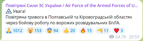 У пресслужбі Повітряних сил Збройних сил України попереджали про бойову роботу по розвідувальних безпілотниках.