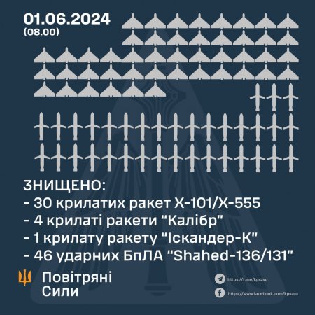 У ніч на 1 червня росіяни завдали ракетно-авіаційного удару по об’єктах критичної інфраструктури в різних регіонах України, застосувавши ракети повітряного, морського та наземного базування, а також ударні БпЛА типу «Shahed», повідомляє пресслужба Повітряних сил України.