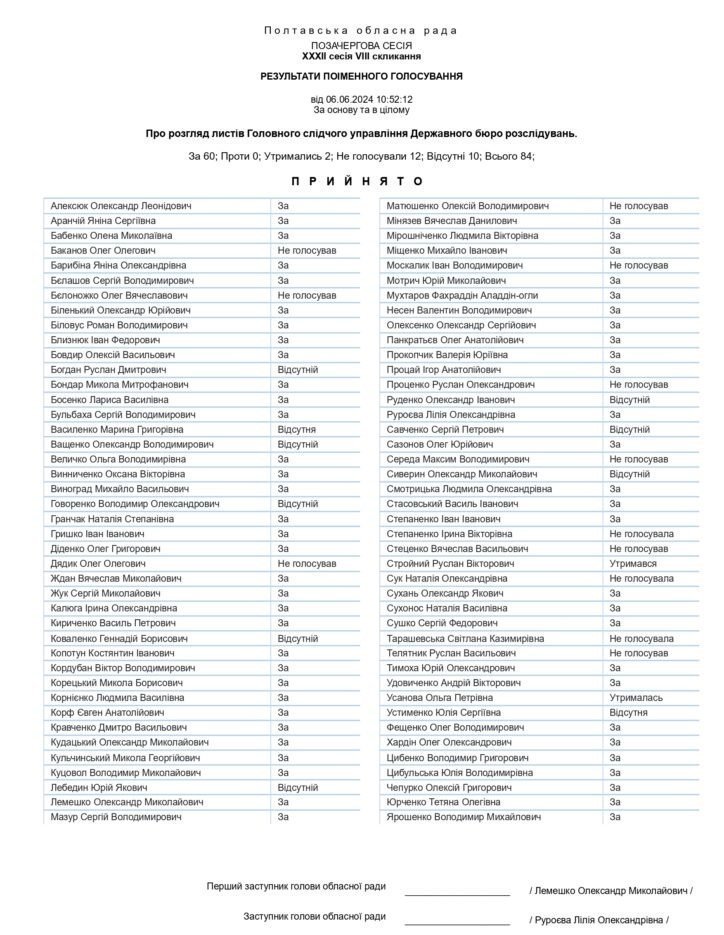 Співробітники ДБР звернулися до Полтавської облради з вимогою визнати її потерпілою стороною. Але учора, 6 червня, під час сесії депутати підтримали рішення, де закликали це «визнати недоцільним». Проголосували за це 60 із 84 депутатів.
