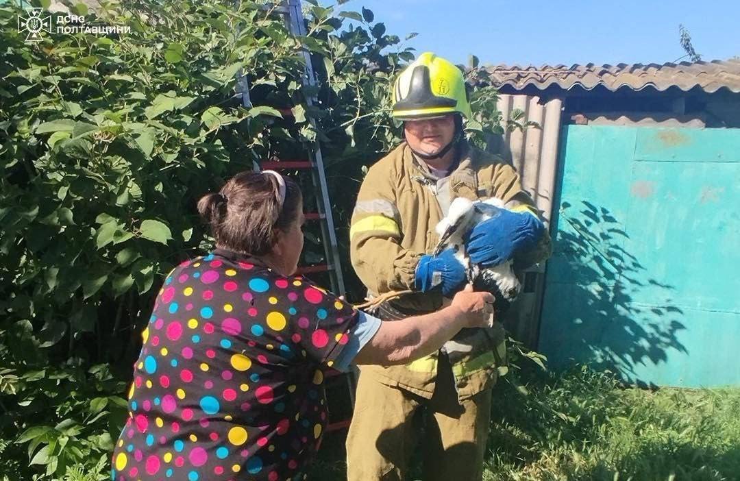 На місце події прибули рятувальники з 7-ї державної пожежно-рятувальної частини. За допомогою драбини вони дісталися до гнізда, зняли пташеня та передали його жінці.