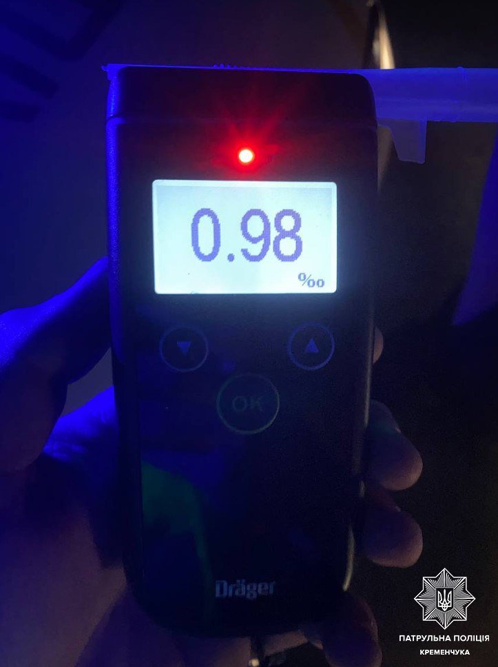 Інспектори запропонували водію пройти огляд на стан алкогольного сп’яніння на місці за допомогою алкотестеру. Результат — 0,98 проміле, що майже в п’ять разів перевищує допустиму норму.
