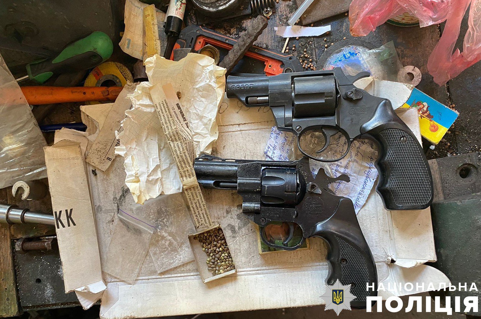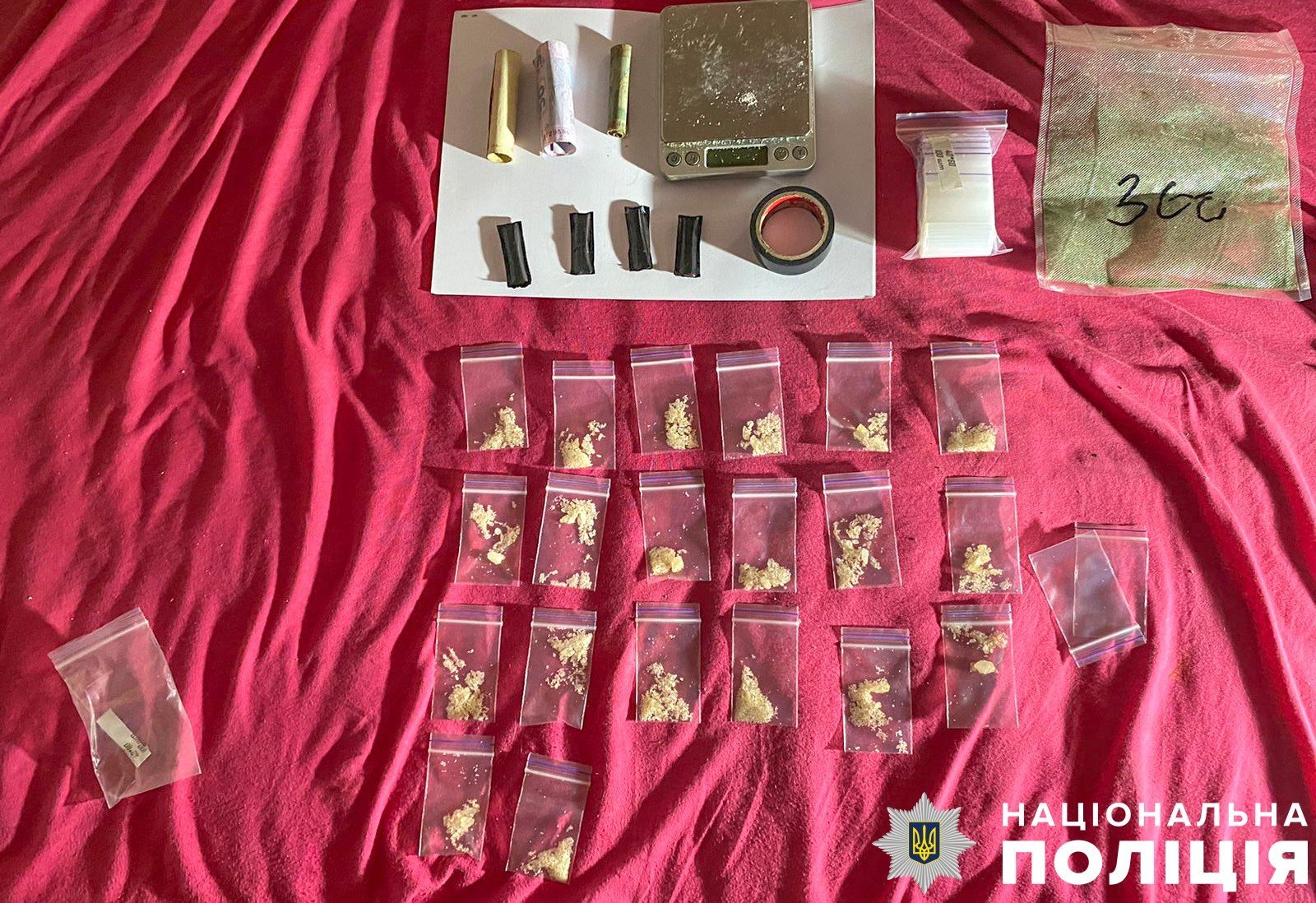 Начальник Управління боротьби з наркозлочинністю Геннадій Пархоменко повідомив, що слідчі вилучили у чоловіка кілька десятків зіп-пакетів із солями «Альфа-PVP» загальною вагою близько пів кілограма, готові для поширення закладки, пакунок з амфетаміном, зіп-пакет з канабісом та два револьвери. Вилучені речові докази направили на судові експертизи.