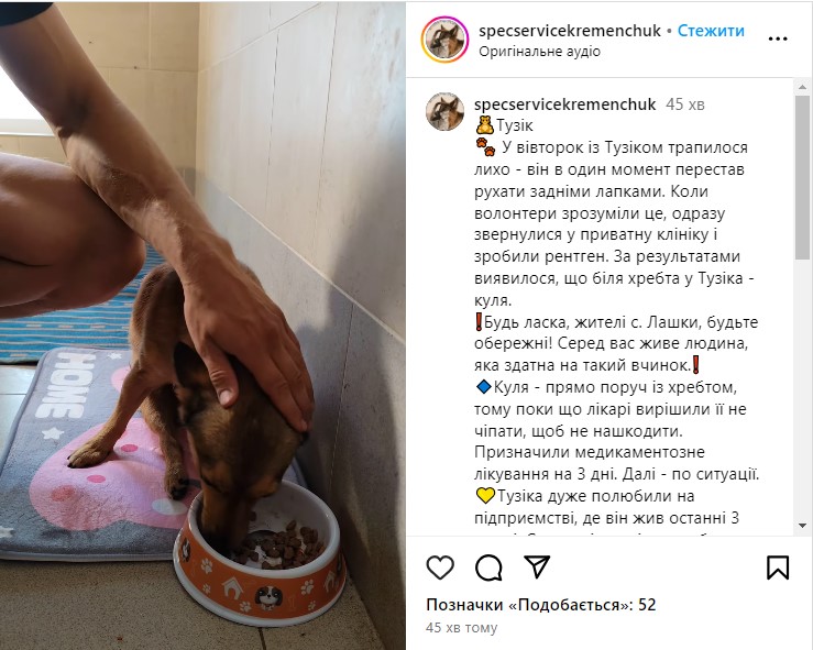 На Лашках у Кременчуці хтось стріляв у собаку. Про це розповіли на інстаграм-сторінці комунально підприємства «Спецсервіс-Кременчук».