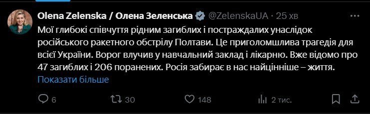Нагадаємо, що зранку у Полтавській громаді лунали вибухи. Згодом поруч з місцем влучання розгорнули оперативний штаб. Згодом стало відомо, що Росія поцілила двома балістичними ракетами по одній з будівель Інституту зв’язку та розташованій поруч лікарні. Більш ніж 180 людей поранені. Станом на цей час відомо про 41 загиблого. Завдяки злагодженій роботі рятувальників та медиків вдалося врятувати 25 осіб, з яких 11 деблоковано з-під завалів. Відзавтра у Полтавській області оголошено триденну жалобу.