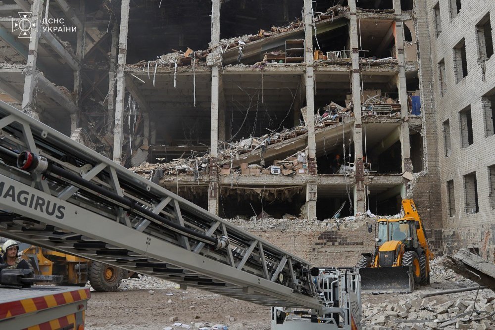 Частково зруйнована одна з будівель Інституту зв’язку, багато людей опинились під завалами. За інформацією відомства, часовий проміжок між тривогою і прильотом був настільки коротким, що застав людей в момент евакуації до бомбосховища. На місці продовжують розбір завалів.