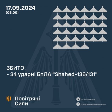 У ніч на 17 вересня 2024 року (з 19.00 по 06.00) радіотехнічні війська Повітряних Сил виявили та супроводили 51 ударного БпЛА, якими Росія атакувала Україну. Про це повідомила пресслужба ПСУ.