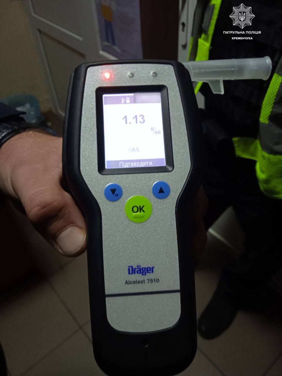 Водій погодився пройти огляд на місці, який показав рівень алкоголю в організмі — 1,13 проміле, що майже у 6 разів перевищує допустиму норму.