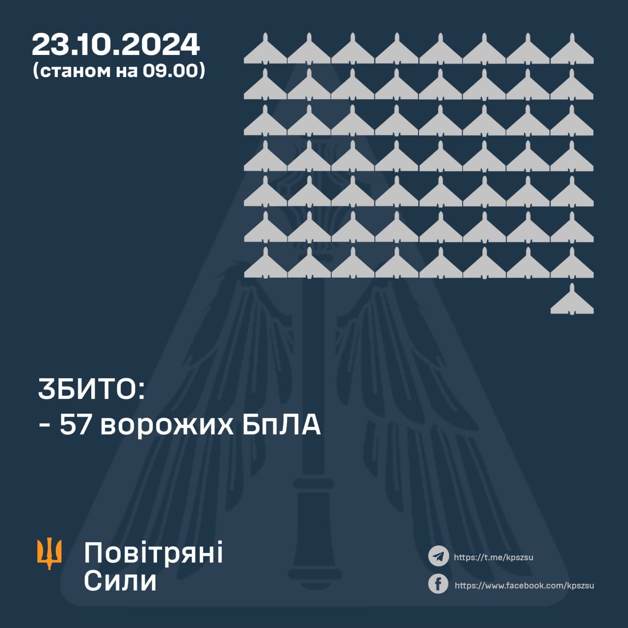Станом на 9.00 підтверджене збиття 57 російських БпЛА в Одеській, Миколаївській, Вінницькій, Сумській, Черкаській, Хмельницькій, Тернопільській, Кіровоградській, Київській, Полтавській, Чернігівській та Харківській областях.