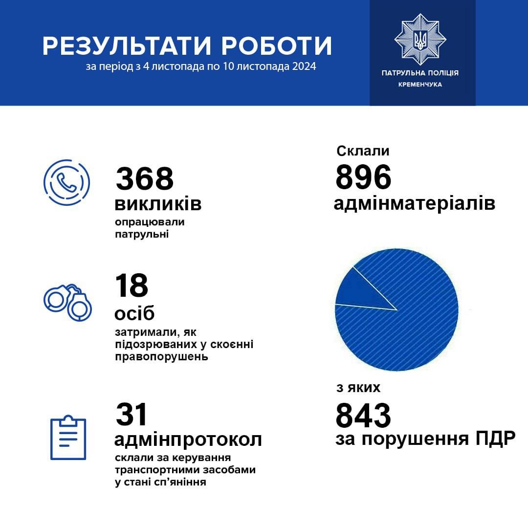 Крім цього, на попередньому тижні патрульні відпрацювали 368 викликів, зупинили 31 нетверезого водія, ще 18 порушників затримали.