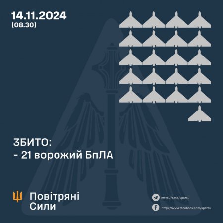 Станом на 8.30 підтверджене збиття 21-го БпЛА противника у Сумській, Харківській, Полтавській та Київській областях.