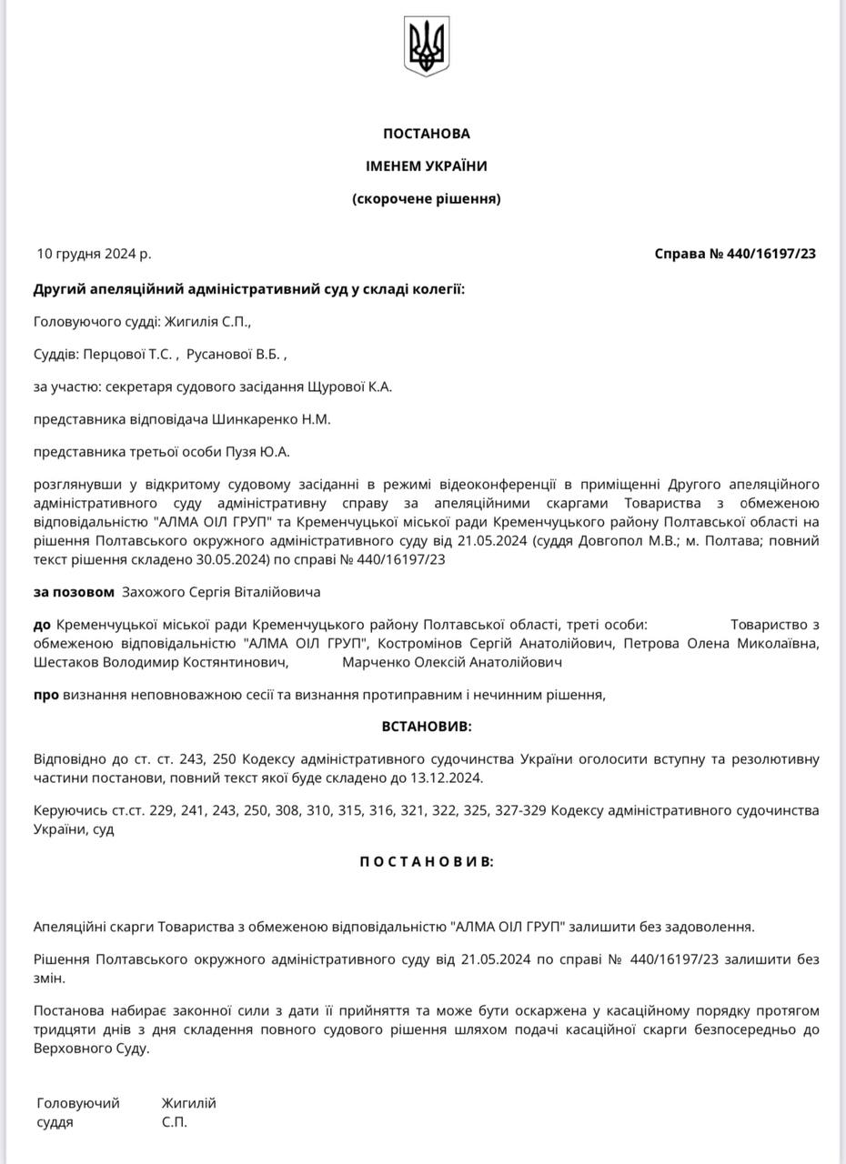 Другий апеляційний адміністративний суд постановив залишити без задоволення апеляційні скарги Кременчуцької міської ради та ТОВ «Алма Оіл Груп», таким чином підтвердивши рішення суду першої інстанції. Про це повідомив депутат міської ради Богдан Лазоренко.