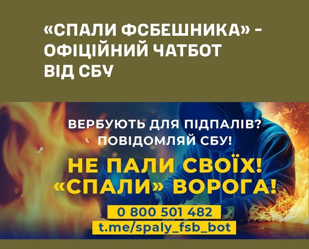 Щоб протидіяти вербуванню громадян, СБУ запустила офіційний чат-бот у телеграмі «Спали» ФСБешника» — t.me/spaly_fsb_bot. На нього, як і на «гарячу лінію» Служби безпеки, можна повідомляти про підозрілі контакти з боку спецслужб РФ. Станом на сьогодні до чат-боту вже надійшло майже 2,3 тисячі повідомлень про спроби вербування!
