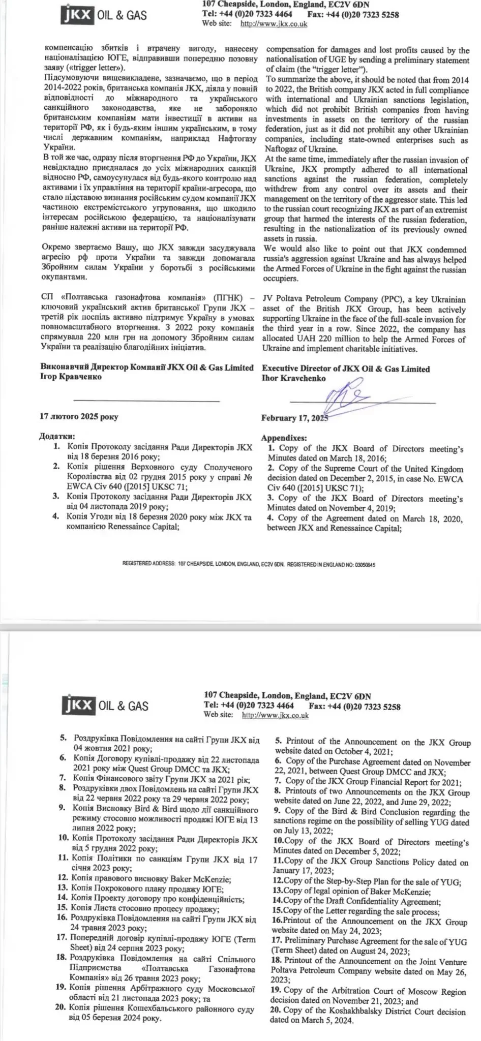 У компанії звертають увагу, що JKX є не українською, а британською, і діє виключно в межах чинного британського законодавства та з моменту введення міжнародних санкцій стосовно країни-агресора, негайно приєдналася до всіх санкцій і повністю втратила будь-який контроль над діяльністю належних їй активів на території РФ, тож не несе жодної юридичної відповідальності за діяльність непідконтрольних підприємств на території Росії та сплату ними податків.