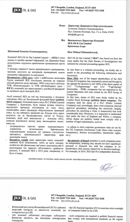JKX направила листа до директора Державного бюро розслідувань Олексія Сухачова та планує офіційно звернутися до правоохоронних органів Великобританії з метою захисту своїх прав.