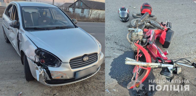За попередньою інформацією, автомобіль Hyundai під керуванням 57-річного водія зіткнувся з мотоциклом, яким керував 18-річний юнак. Унаслідок аварії водія мотоцикла та 16-річного пасажира госпіталізували з травмами.
