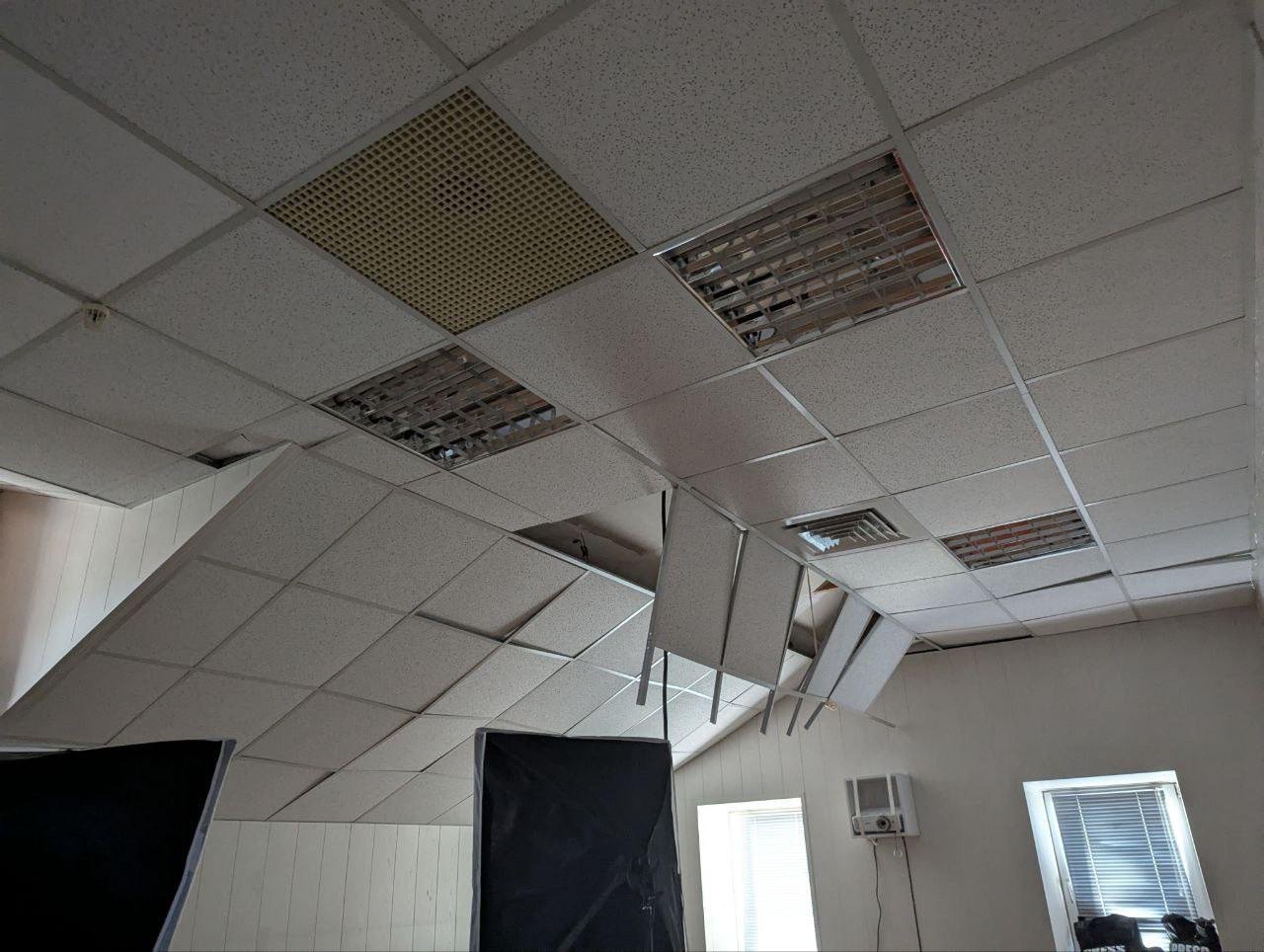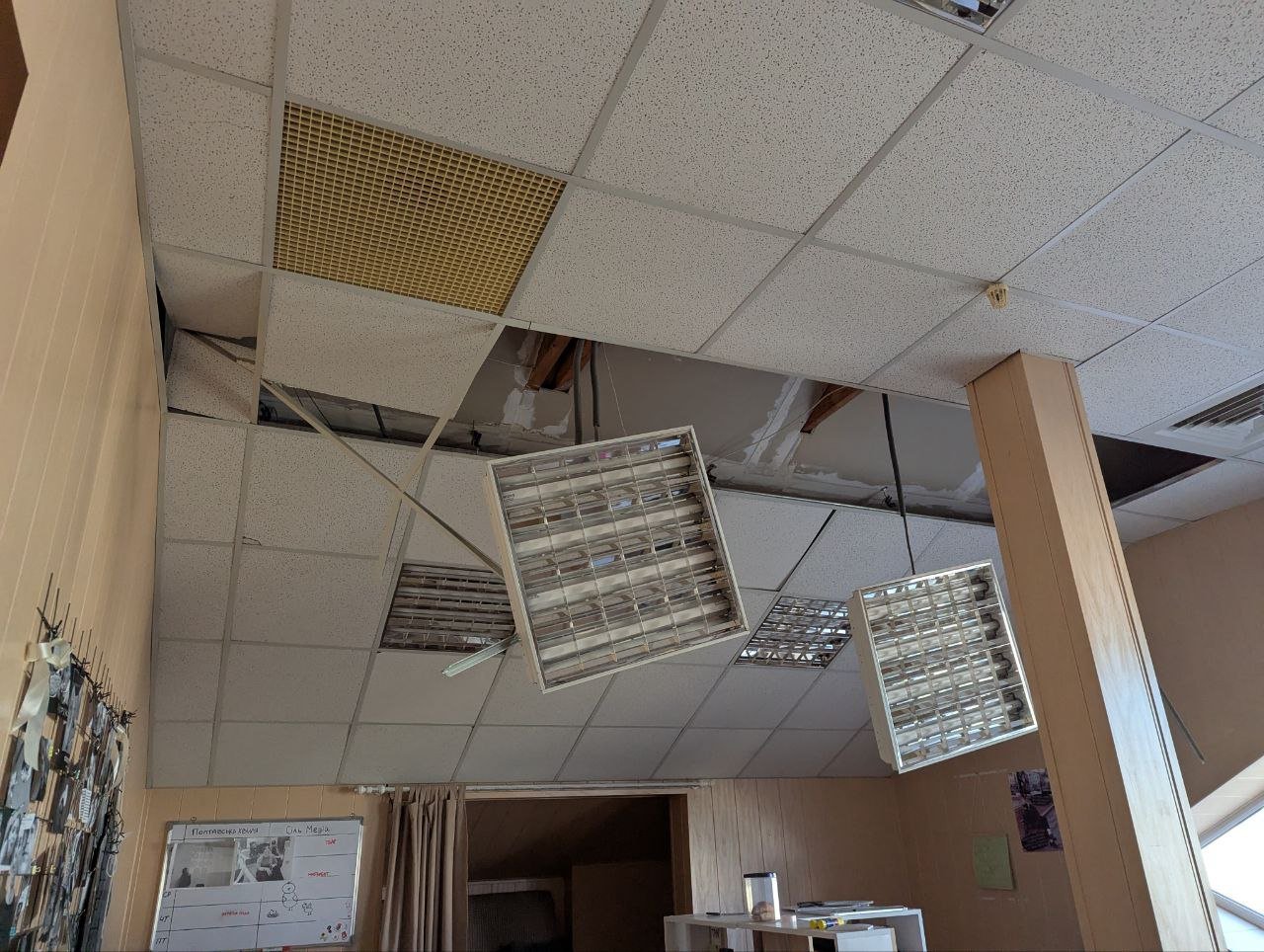 Колеги пишуть: попри те, що окремі ділянки офісного приміщення наразі непридатні для роботи через загрозу подальших обвалів, вони все ж продовжують виконувати свою роботу. Частина стелі обвалилася, металеві елементи конструкцій були деформовані, світильники вирвані з кріплень і звисають зі стелі.