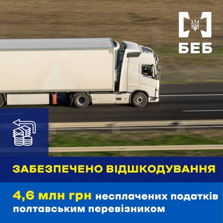 Детективи Територіального управління Бюро економічної безпеки у Полтавській області забезпечили відшкодування понад 4,6 млн грн збитків, завданих державному бюджету компанією, що спеціалізується на автоперевезенні. Про це повідомила пресслужба БЕБ України.